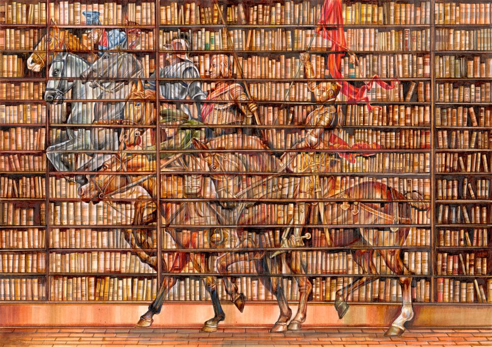 この作品は構想から完成まで約3カ月かかりました。まず、すべての本を描き、その後に騎士を本棚に描き入れました。本の影や反射光によって、騎士を引き立つようにしました。